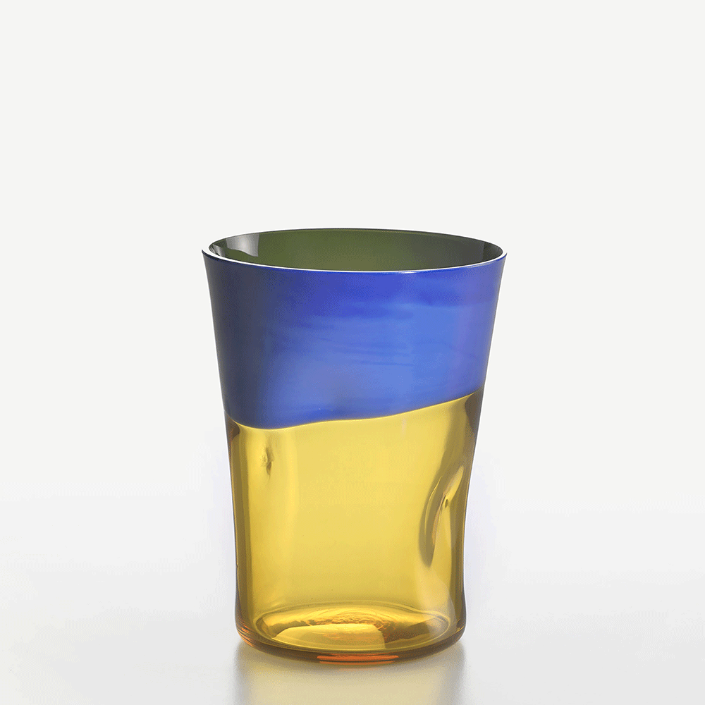 Dandy è una creazione in cui si fondono casualmente trasparenze e colori opachi e lucidi, in ben 12 combinazioni diverse. Lo rende ancor più originale l’utilizzo di una tecnica elaborata nel 1951 che prevede uno schiacciamento del bicchiere, il quale si adatta alla mano ed acquisisce un’ergonomia distintiva. Ogni Dandy è, per questo motivo, un pezzo unico.