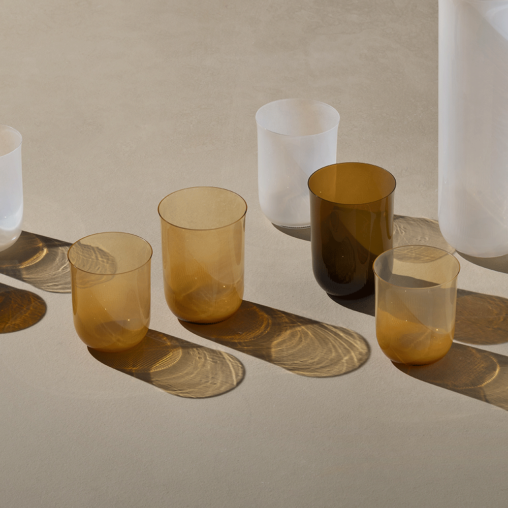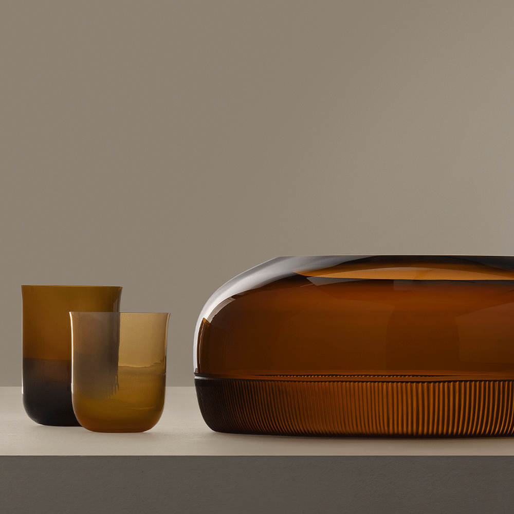 € 220,00Alba Caraffa, Ambra Opalino Mezzo Rigato. Una serie di vetri opalini disegnati da Federico Peri, con forme essenziali e un fondo delicatamente microtesturizzato che rivela la cura artigianale nei dettagli più fini.