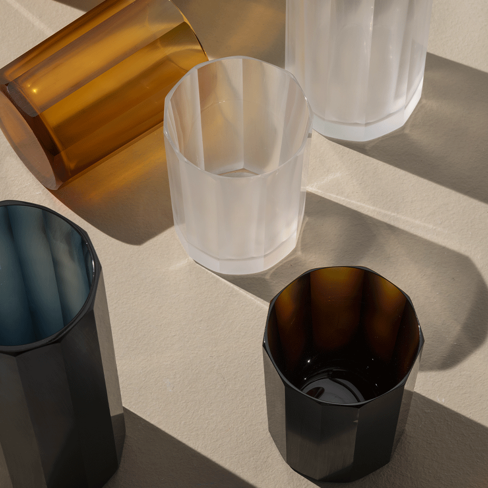 € 220,00Alba Caraffa, Ambra Opalino Mezzo Rigato. Una serie di vetri opalini disegnati da Federico Peri, con forme essenziali e un fondo delicatamente microtesturizzato che rivela la cura artigianale nei dettagli più fini.